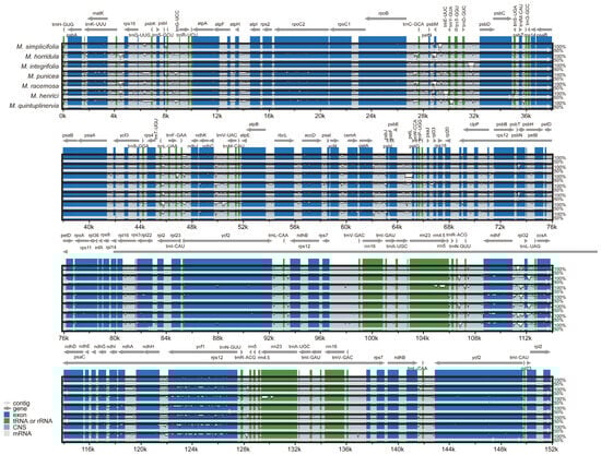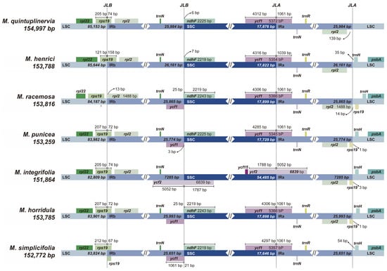 The following supporting information can be downloaded at: https://www.mdpi.com/article/10.3390/genes15101301/s1, Table S1. Types and numbers of SSRs in the chloroplast genomes of M. simplicifolia, M. horridula, M. integrifolia, M. punicea, M. racemose, M. henrici, and M. quintuplinervia.