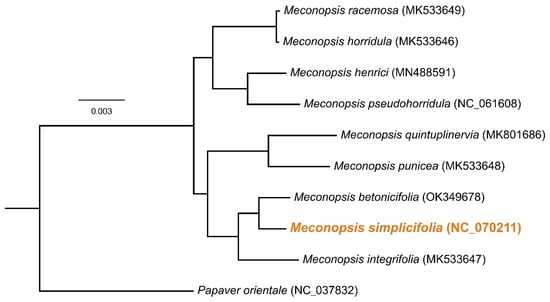 A species tree based on the coding sequences of 75 protein-coding genes shared by the cp genomes of 10 Papaveraceae members including M. simplicifolia (NC_070211; this study), M. horridula (MK533646) [30], M. integrifolia (MK533647) [30], M. punicea (MK533648) [30], M. racemosa (MK533649) [30], M. henrici (MN488591) [32], M. quintuplinervia (MK801686) [33], M. pseudohorridula (NC_061608; unpublished), M. betonicifolia (OK349678; unpublished), and the outgroup species Papaver orientale (NC_037832) [37]. All nodes received 100% bootstrap support. Orange represents M Simplicifolia chloroplast genome.