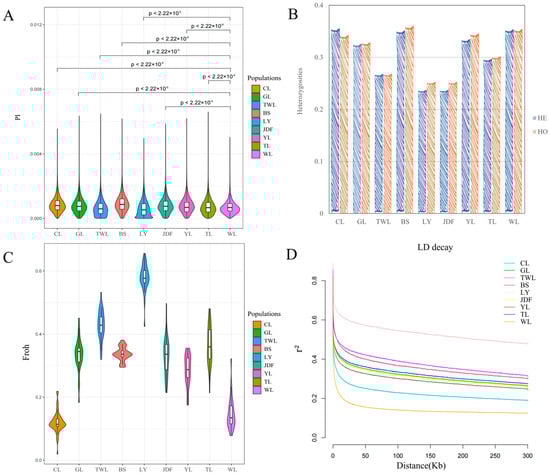 Genetic parameters, including observed heterozygosity (HO), expected heterozygosity (HE), and nucleotide diversity (Pi), were analyzed using VCFtools v0.1.13. Pi was analyzed using a sliding-window approach with a window size of 5 kb. The genome inbreeding coefficients (Froh), defined as the sum of ROH (runs of homozygosity) lengths of an individual divided by the total length of the autosomes, were calculated using PLINK v1.9 with the following comments: --homozyg-window-snp 50 --homozyg-density 50 --homozyg-window-het 3 --homozyg-window-missing 1. Additionally, PopLDdecay v3.40 [] was used to perform linkage disequilibrium (LD) analysis among all populations, and LD plots were drawn using the Plot_MultiPop module.
