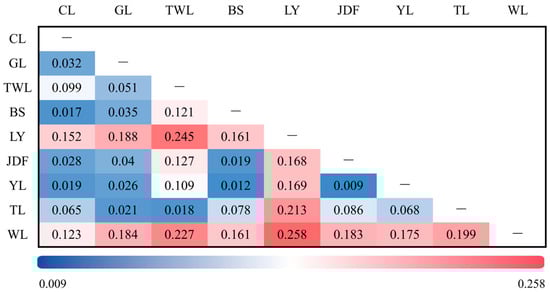 The pairwise F-statistics (Fst) were calculated to investigate the genetic differentiation. Fst values observed between all populations ranged from 0.009 to 0.258. Huge differentiation with an Fst value of 0.258 was merely observed between population LY and WL. High differentiation with Fst values ranging from 0.152 to 0.245 was observed between LY, WL, and the remaining seven populations, except for the moderate differentiation between WL and CL. While negligible differentiation or moderate differentiation with Fst ranging from 0.009 to 0.127 were observed between populations BS, CL, TL, GL, JDF, TWL and YL (Figure 2).