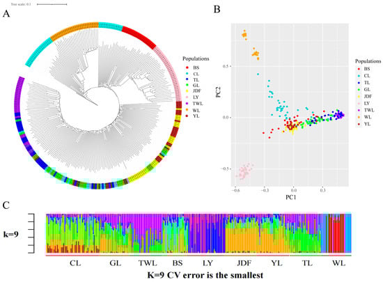 To further elucidate the genetic relationships among the nine populations, population structure was analyzed. First, the reconstructed phylogenetic tree clustered the 288 individuals into three clades, with bootstrap values at root node and internal nodes exceeding 70: all individuals from the WL population and 21 individuals from the CL population formed one cluster; all individuals from LY and BS populations, along with another 14 individuals from the CL population, formed the second cluster; all individuals from TL, GL, JDF, YL, and TWL populations, along with the remaining 15 individuals from the CL population, formed the third cluster, with individuals from each population interspersed (Figure 3A). These findings were subsequently supported by the PCA plot, which highlighted a clearer separation of the WL and LY populations from the others, reinforcing their distinct genetic profiles (Figure 3B). Admixture analysis provided additional insight into the ancestral composition of each individual. The cross-validation error value was lowest when K was nine, and the result showed evidence of admixture, with each population displaying multiple ancestral components (Figure 3C).