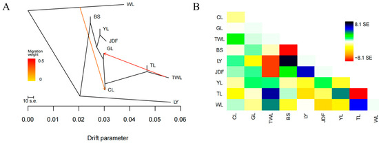 Results of gene flow analysis. (A) Maximum likelihood tree. Arrows indicated migration event and the heat map indicated migration weight. (B) Scaled residual fit between observed data and predicted model with two migration events.