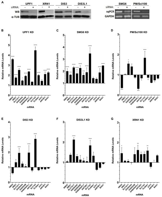 To study the impact of SMG6, PM/Scl100, DIS3, DIS3L1, or XRN1 on mRNA levels of natural NMD targets, we performed knockdowns (KDs) of each ribonuclease. As a positive control for NMD targeting, we knocked down UPF1, a key RNA helicase essential for initiation of the NMD pathway [41,42,43,44,45,46,47,48]. A siRNA targeting the luciferase mRNA sequence was used as a negative control (KD LUC). The KDs efficiency was monitored by sqPCR for SMG6 and PM/Scl100 and by Western blot analysis for UPF1, XRN1, DIS3, and DIS3L1 (Figure 1A). Subsequently, we assessed by RT-qPCR the effect of altering ribonuclease levels on the expression of selected natural NMD targets.