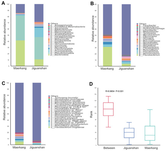 Histogram of the relative abundance of the top 20 species at the phylum level (A), genus level (B), and species level (C). (D) ANOSIM between water samples from the two fish farms.
