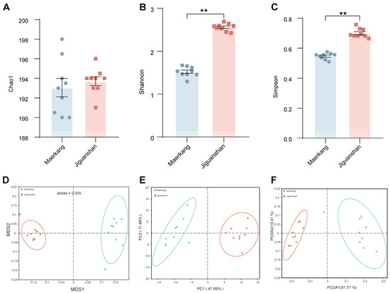 NMDS demonstrated that the samples from Maerkang and Jiguanshan were separately clustered (Figure 2D). Furthermore, the PCA of the microbial community indicated that the water samples from the two farms exhibited relatively distant clustering (Figure 2E). The results of the PCoA were analogous to those of the PCA, with no intersection between the water samples from the two regions (Figure 2F).