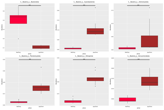 The results of the MetaGenomeSeq analysis revealed that the abundance of Bacteroidota in Maerkang was significantly greater than that in Jiguanshan at the phylum level (top six) (Figure 3, p < 0.01). However, Cyanobacteriota, Actinomycetota, Planctomycetota, Nitrospirota, and Verrucomicrobiota were more abundant in Jiguanshan (Figure 3, p < 0.01).