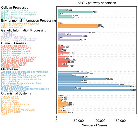 A comparison with the KEGG database revealed that the microorganisms in the water samples were predominantly enriched in pathways associated with metabolism, genetic information processing, environmental information processing, cellular processes, human diseases, and organismal systems (Figure 4). A further comparative analysis at KEGG level 2 revealed that the five most abundant metabolic pathways were, in descending order, amino acid metabolism, carbohydrate metabolism, energy metabolism, metabolism of cofactors and vitamins, and membrane transport (Figure 4).