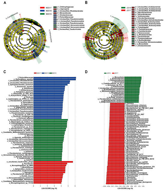 (A) LEfSe analyses showed that the microbial differences between water samples from Maerkang in different breeding years from 2017 to 2019 were greater at the family and class levels. (B) LEfSe analyses showed that the microbial differences between water samples from Jiguanshan in different breeding years from 2016 and 2017 were more at the family and order levels. (C,D) The bar chart generated by metagenomic sequencing highlights the significant differences in microorganisms present in water samples from different years at the Maerkang and Jiguanshan fish farms. LDA score equals 4.