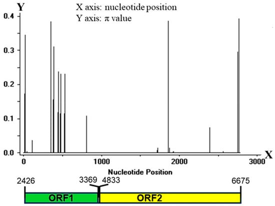 The CDS1 and CDS2 sequences and the corresponding amino acids of the Pi-ta were assembled by DNASTAR v. 7.10 software (https://www.dnastar.com/, accessed on 27 June 2023). DnaSP v5.10.01 [22] was used for calculation of polymorphic sites (π), the number of DNA haplotypes, and the sliding window. Haplotype network analysis was performed using TCS v. 1.21 [23] (https://www.softpedia.com/get/Science-CAD/Posada-TCS.shtml, accessed on 29 April 2024). Fontaine’s method was used to calculate the diversity index of the rice blast fungus population [24]: diversity index = (1 − ∑ni = 1Pi2), where Pi is the frequency of haplotype i in a population. Then, Tajima’s test of neutrality was performed using MEGA v. 5.10. A phylogenetic tree was constructed using MEGA v. 5.10 using the neighbor joining method [25].