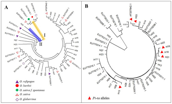 Neighbor joining phylogenetic tree of Pi-ta resistance (R)/susceptibility (S) alleles. (A), systematical evolution of 44 Pi-ta alleles. R/S alleles of the Pi-ta can be divided into 2 different clusters. Cluster I contained 4 Pi-ta haplotypes (wild O. barthii, O. glaberrima, O. sativa f. spontanea, and O. sativa Indica Group), while Cluster II contained wild Oryza rufipogon and Oryza glaberrima, and all of Pi-ta haplotypes in rice landraces in Yunnan. (B), the phylogenetic relationship of Pi-ta R/S alleles. The Pi-ta R alleles were derived from S alleles in rice landraces in Yunnan. These Pi-ta haplotype alleles were obtained from rice landraces in Yunnan (28 Pi-ta haplotype alleles, H01–H28) and the published GenBank (16 Pi-ta haplotype alleles, accession number: AF207842.1, EU770206.1, EU770207.1, EU770208.1, EU770209.1, EU770210.1, EU770211.1, EU770212.1, EU770213.1, EU770214.1, EU770215.1, EU770216.1, EU770217.1, EU770218.1, EU770219.1, EU770220.1).