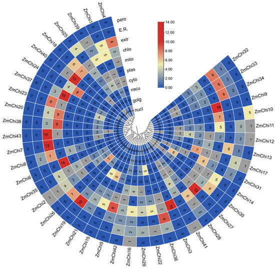 A heat map depicting the subcellular localization of all ZmChi genes within plant cells, including the plasmid, endoplasmic reticulum, Golgi apparatus, vesicles, mitochondria, chloroplasts, nucleus, cytoplasm, ectoplasm, and peroxisomes. Blue indicates the lack of the gene in that area, gray indicates a small functional presence, and red indicates the highest functional importance of the gene in that specific region. Note: nucl: nucleus; golg: Golgi; vacu: vesicle; cyto: cytoplasm; plas: plasmid; mito: mitochondrion; chlo: chloroplast; extr: outer matrix; E.R.: endoplasmic reticulum; pero: peroxisome.
