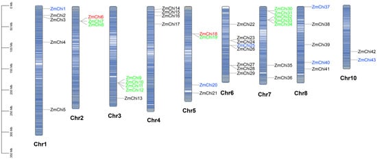 Chromosome distribution of chitinase genes in maize. Note: Genes are color-coded based on duplication type: green for tandem duplicates, blue for segmental duplicates, and red for those that are both tandem and segmental duplicates.