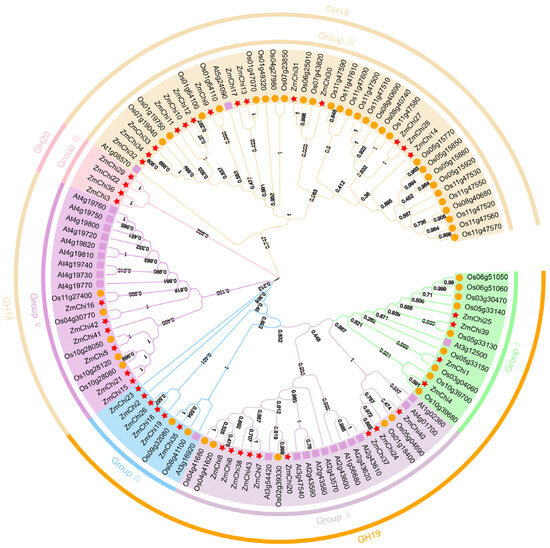 Based on the previous studies on chitinase gene families in Arabidopsis thaliana and rice, a phylogenetic tree was constructed by combining the classification of GH families in order to deeply investigate the genetic relationship and biological functions of maize chitinase gene families (Figure 3). The chitinase genes were classified into six groups with varying numbers of genes in each group by multiple sequence alignment and phylogenetic analysis.