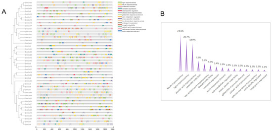Investigation of cis-regulatory elements within the promoter regions of the maize chitinase gene family: (A) Examination of the prevalence of diverse cis-regulatory elements across these promoters. (B) Assessment of the frequency of various cis-regulatory element types within these promoter sequences.