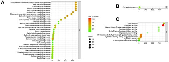 ShinyGO v0.741 was used for Gene Ontology Enrichment Analysis; functional annotations were obtained for 43 maize chitinases (Figure 6). The enrichment analysis of biological functions indicated that the ZmChi genes were predominantly associated with processes such as carbohydrate metabolism, chitin degradation, and overall catabolism (Figure 6A). Moreover, enrichment analysis of cellular functions revealed that ZmChi genes were specifically associated with the extracellular compartment (Figure 6B). In terms of cellular functions, ZmChi genes exhibited significant enrichment in hydrolase activity, chitinase activity, and carbohydrate derivative binding (Figure 6C).