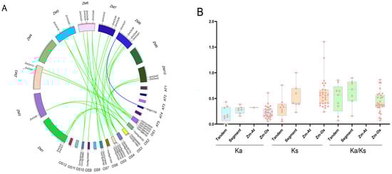 To investigate the collinearity of maize chitinase genes within their species and in comparison to genes from Arabidopsis and rice, TBtools software was utilized. The MCScanX tool in TBtools was used to analyze gene duplication events, and the rates of non-synonymous (Ka) to synonymous (Ks) substitutions were calculated [70]. A Ka/Ks ratio below 1 indicates purifying selection, a ratio of 1 suggests neutral evolution, and a ratio above 1 implies positive selection. The divergence time was approximated using the formula T = Ks/(2λ), with λ assumed to be 6.5 × 10−9 [71,72].