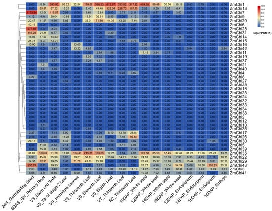 Employing transcriptome sequencing data across diverse maize tissues (SRP010680) [78], an expression heat map of maize chitinase genes was generated using maize B73_V5 genome data (Figure 8). Only a few maize chitinase family genes showed high expression levels prior to 10DAP_Whole seeds and low expression levels after 10DAP_Whole seeds. ZmChi1 demonstrated elevated transcript abundance before the 10-day post-pollination mark in entire seeds. ZmChi43 and other genes were highly expressed after 10DAP_Whole seeds. ZmChi35, ZmChi22, and ZmChi29 were highly expressed across all tissues, suggesting that they play a role in various physiological processes during maize development. Conversely, the majority of chitinase family genes exhibited low expression levels across maize tissues. Ten genes, including ZmChi4, ZmChi8, ZmChi10, ZmChi19, ZmChi21, ZmChi25, ZmChi27, ZmChi36, ZmChi37, and ZmChi40, were not expressed in most maize tissues. ZmChi6 were highly expressed only in 24H_Germinating Seed and were not expressed in other tissues, ZmChi28 were highly expressed in 24H_Germinating Seed and expressed slightly in Stem and SAM and almost undetectable in root. These distinct expression patterns suggest unique roles for maize chitinase genes in different tissues.