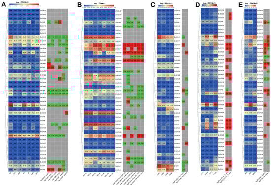 Transcriptome sequencing data from various maize tissues under stress were obtained from NCBI. Sequences from the SRA database were converted to Fastq format using the SRA Toolkit. FastQC (version 0.12.1) assessed the data quality [76], and Trimmomatic (version 0.40) was used to filter out low-quality sequences, producing clean datasets [77]. The TBtools software was employed, incorporating Hisat2-Build for indexing, Hisat2-Align for read alignment, Stringtie-Assembly for assembling transcripts, and Stringtie-Quantify for estimating expression levels. The processed and filtered data were aligned against the maize B73_V5 genome to produce FPKM files, facilitating the estimation of gene expression levels. TBtools’ HeatMap tool was then used to perform a differential gene expression analysis on the count data of each gene.