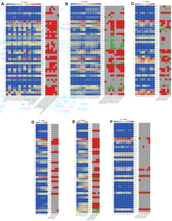 A heatmap displaying maize chitinase gene expression under different biotic stress conditions. (A) Gene expression profiles of maize chitinase genes when subjected to black tassel disease stress. The experimental setup included a control treatment (uninfected plants) and treatments with the strains SG 200 and UMAG_02297, which are live nutrient fungi responsible for causing black tassel disease in maize. Additionally, the knockout mutant strain, KO_UMAG_02297, was included. Data were taken 3 days after infection (3 dpi) on six different types of maize: B73, CML 322, EGB, Ky 21, Oh 43, and Tx 303. (B) The expression patterns of maize chitinase genes under stem rot stress. Two maize varieties, A08 (resistant) and K09 (susceptible), were infested with Fusarium graminearum. The control treatment (CT) consisted of uninfected plants. Plants with pests were examined at different intervals including 6 h after infestation (hpi), 12 hpi, 24 hpi, 48 hpi, and 72 hpi. (C) Furthermore, the expression patterns of maize chitinase genes in response to maize gray spot disease stress were analyzed in two different varieties, Y (‘Yayu 889’) and Z (‘Zhenghong 532’); Y and Z are resistant and susceptible to gray spot disease, respectively. Gray spot disease in these plants was evaluated at 81, 89, 91, and 93 days post-infection (dpi). (D) The maize chitinase gene family’s response to sugarbeet nightshade moth and Asian corn borer infestation was analyzed. The control group (CT) consists of healthy plants, with 1 hpi, 4 hpi, 6 hpi, and 24 hpi indicating 1, 4, 6, and 24 h post-infestation, respectively. (E) The temporal expression of maize chitinase genes following Asian corn borer attack, with time points at 0 hpi, 4 hpi, 12 hpi, and 24 hpi corresponding to 0, 4, 12, and 24 h post-infestation intervals. (F) Maize chitinase gene family expression patterns during aphid stress. CT-0 h vs. CT-96 h correspond to 0 h vs. 96 h control treatments (uninfected plants); Aphid-2 h, Aphid-4 h, Aphid-8 h, Aphid-24 h, Aphid-48 h, and Aphid-96 h correspond to 2 h, 4 h, 8 h, 24 h, 48 h, and 96 h after aphid infestation, respectively. Note: Each chart depicts the original FPKM value in the left box and the value of log2(multiple changes) in the right box, highlighted in red (up-regulated) or green (down-regulated), |FC| ≥ 1.
