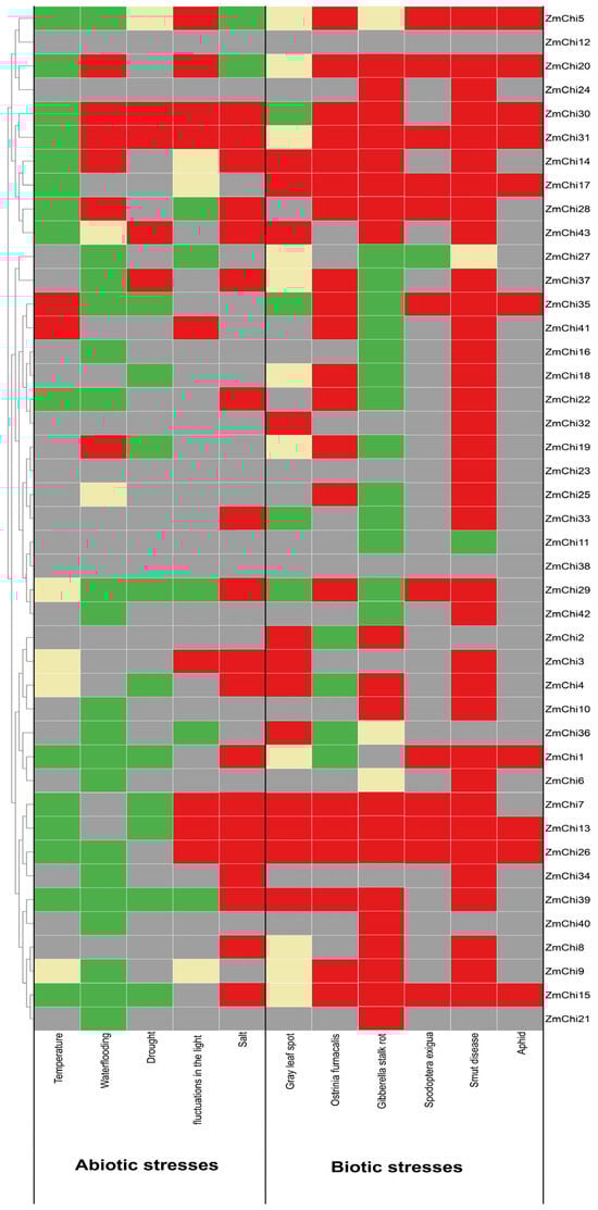 Heatmap depicting the different expression levels of maize chitinase genes in response to abiotic and biotic stresses. Here, gray denotes unchanged expression, red signifies upregulation, green indicates downregulation, and yellow represents a mix of both upregulation and downregulation.
