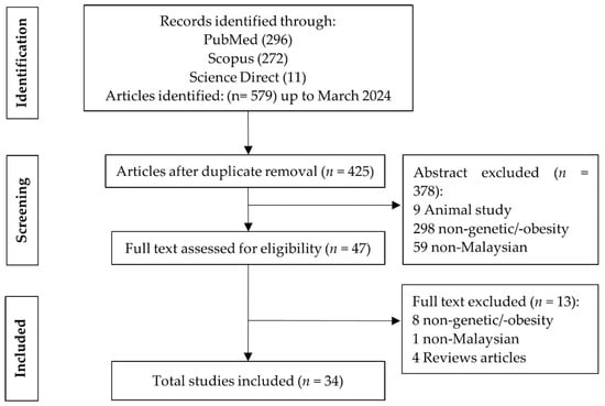 Based on the keyword searches, 579 potentially eligible records were identified, out of which 153 articles were excluded due to redundancy. Following abstract screening, 378 articles were further excluded, leaving 47 articles for full-text screening. Subsequently, 13 studies were excluded during the full-text review, resulting in the inclusion of 34 studies for data extraction and analysis. In total, 391 articles were removed during screening for following reasons: 9 studies involved animal subjects, 306 were unrelated to genetics or obesity, 60 articles were conducted among non-Malaysians and 16 were review papers (Figure 1).