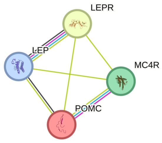 Out of the thirty-three genes for which selected genetic variants were reported as significantly associated with obesity, only four genes (LEP, LEPR, POMC, and MC4R) are known to be linked with monogenic obesity. Mutations in these genes can cause early-onset obesity which is not easily influenced by environmental factors alone, unlike polygenic obesity. Since the majority of the reviewed articles are highly heterogenous, biased in terms of selecting candidate genes, and the studies were mostly underpowered, only the genes associated with monogenic obesity were selected for protein—protein interaction analysis. The STRING database shows that interactions between LEP, LEPR, POMC, and MC4R have been reported from various experimental data, curated databases, and co-expression studies (Figure 2). Nodes in these networks represent proteins, and the edges denote their interactions. The roles of these genes in many biological processes and important molecular pathways are also well established. Examples of Gene Ontology (GO) biological processes involving some or all of the genes include response to a melanocyte-stimulating hormone, leptin-mediated signaling pathway, regulation of appetite, and regulation of feeding behavior. In terms of KEGG pathways, examples include adipocytokine signaling pathway and AMPK signaling pathway (Table 3).