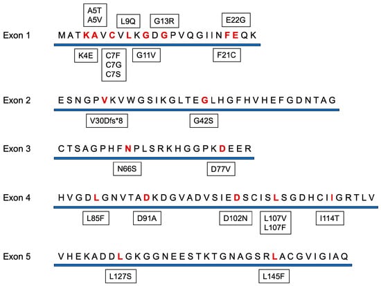 Amino acid sequence of SOD1 and representative mutations known in ALS. Mutation data were extracted from the ALS online database (ALSoD, http://alsod.iop.kcl.ac.uk, accessed on 11 October 2024). Of the more than 200 known mutations, mutations reported in at least 5 individuals are listed here. Red letters indicate amino acids with high mutation frequency.