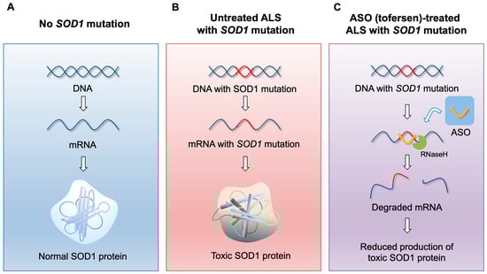 ASO (tofersen) mechanism of action. (A) In the absence of the SOD1 gene mutation, functional SOD1 protein is produced by normal transcription and translation. (B) In the presence of SOD1 gene mutation, toxic SOD1 protein is produced by its transcription and translation. (C) When tofersen, an ASO gapmer against the SOD1 gene, specifically binds to SOD1 mRNA, SOD1 mRNA is degraded by the activity of RNase H, inhibiting the production of toxic SOD1 protein.