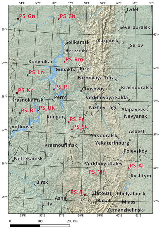 Location diagram of the studied P. sylvestris populations. P. sylvestris populations in the forests of Perm Krai: PS_Ch—Cherdynskoye, PS_Gn—Gaynskoye, PS_Rm—Bereznikovskoye, PS_Ln—Kudymkarskoye, PS_Pr—Kishertskoye, PS_Pl—Dobryanskoye, PS_Kr—Sivinskoye, PS_Bl—Tchaikovskoye, PS_Sk—Oktyabrskoye, PS_Uk—Permskoye; from the Republic of Bashkortostan: PS_Mh—Duvanskoye, PS_Sl—Salavatskoye; from the Chelyabinsk Region: PS_Ar—Kaslinskoye forest.