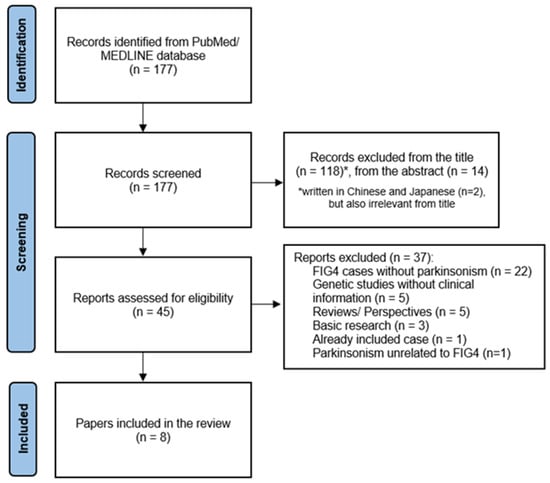 We conducted a descriptive review of papers written in English and indexed in the PubMed/MEDLINE database until August 2024, reporting patients who developed parkinsonism and were carriers of FIG4 mutations. In the initial search strategy, various combinations of the term “FIG4” were used alongside “parkinsonism”, “Parkinson’s disease”, “parkinson”, “extrapyramidal”, “tremor”, “neurodegeneration” or “central nervous system”, either as MeSH terms or as plain text. However, due to the limited number of results obtained at first, the search was broadened to be more inclusive. More specifically, we expanded our approach by conducting a separate search using solely the term “FIG4” to capture additional literature not identified with the initial search parameters.
