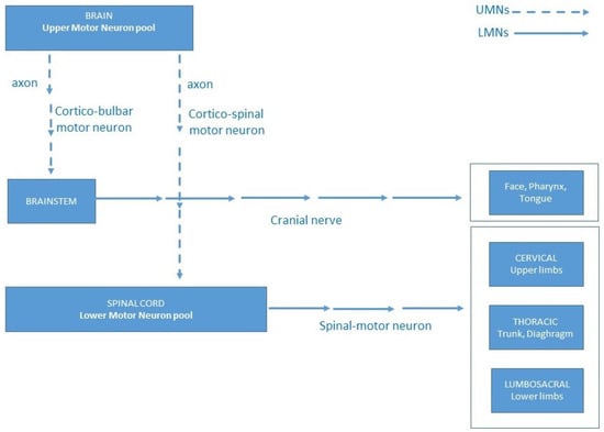 Motor neuron disease (MND) is an umbrella term for a phenotypically heterogeneous group of progressive and, in some types, inevitably fatal disorders that affect primarily motor neurons (MNs). MNs are cells responsible for controlling the activity of skeletal muscles necessary for voluntary actions, such as walking, breathing, speaking, and swallowing. MNs are classified into two main types: upper MNs (UMNs) and lower MNs (LMNs) [1]. UMNs originate in the primary motor cortex and convey signals via their axons through the corticospinal tract to stimulate interneurons and lower motor neurons. LMNs originate in the anterior horn of the spinal cord or in the cranial nerve nuclei of the brainstem [2]. A subtype of these lower motor neurons, referred to as spine motor neurons (SpMNs), is situated in the ventral horn of the spinal cord and governs effector muscles in peripheral areas (Figure 1) [3].