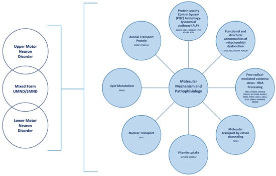 Understanding the molecular mechanisms and pathophysiology of motor neuron disorders (MNDs) is critical for managing these conditions and evaluating the implications of emerging disease-modifying therapies. Despite variations in symptoms, age of start, and development across motor neuron diseases (MNDs), the predominant pathogenic mechanism shared by most MNDs is the disruption of proteostasis and subsequent proteotoxicity [23]. This pathomechanism may be directly associated with mutations in genes that encode proteins integral to the protein quality control system (PQC), specifically the autophagy–lysosomal pathway (ALP), which is responsible for the elimination of cytosolic components, such as protein aggregates or damaged organelles (ASAH1, UBE1, UBQLN1, LYST, ATXN3, and SCP2) [24]. Autophagy is a crucial physiological mechanism that sustains proteostasis in neurons and other cell types commonly impacted in MNDs [25]. Its function in MNDs is highly intricate, with both inadequate and excessive activity contributing to the onset and/or advancement of various types of MNDs [5]. Furthermore, the reasons for this mechanism’s association with several clinical disorders remain ambiguous; other modifying elements may variably enhance or mitigate the harmful or beneficial effects of autophagy in each neuronal type [9]. Other processes involved in the pathophysiology of motor neuron diseases include structural and functional abnormalities of mitochondria (SOC2, TK2, DGUOK, and PLAG26), free-radical-mediated oxidative stress, RNA processing (VRK1, EXOSC3, EXOSC8, TSEN54, SLC254A6, MORC2, SMN1, TRIP4, ASCC1, UBA1, GLE1, ERBB3, IGHMBP2, and RBM28), cation-channel-mediated molecular transport (TRPV4), vitamin uptake (SLC52A3 and SLC52A2), nuclear transport (GLE1), lipid metabolism (ASAH1), and axonal transport proteins (BICD2 and DYNC1H1) [19,26,27]. The intersections between protein aggregation, stress granules, and autophagy are critical areas of study in understanding MNDs’ pathogenesis. Consequently, identifying an appropriate target for medications that might modulate autophagic pathways remains a challenge. Emerging evidence suggests that strategies designed to enhance pre-activated autophagy will yield more customized therapies to mitigate the neurotoxicity of aggregation-prone proteins in various motor neuron diseases associated with impaired responses to proteotoxic stress (Figure 2) [28].