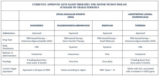 Three recently authorized gene-based therapies—nusinersen, onasemnogene abeparvovec, and risdiplam—have dramatically improved outcomes for patients with spinal muscular atrophy (SMA) (Figure 3) [39,40].