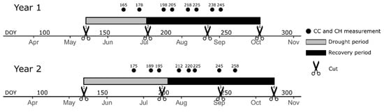Phenotypic data were used from our previous work [22], in which we phenotyped a panel of 395 red clover accessions for drought responses in two parallel fields, as follows: a ‘drought-treated’ field where drought was simulated using rain-out shelters; and a ‘control field’ that was irrigated and served to calculate relative performance indices. Four cuts were taken per year, and drought periods lasting six to eight weeks were imposed between the first and second cuts in two subsequent production years or growing seasons (Figure 1). CC and CH were monitored throughout the two growing seasons. Subsequently, relative performance indices (Yr), displaying the relative performance of the drought-treated plots compared to the control plots, were obtained for each accession and each trait, using the following formula:
