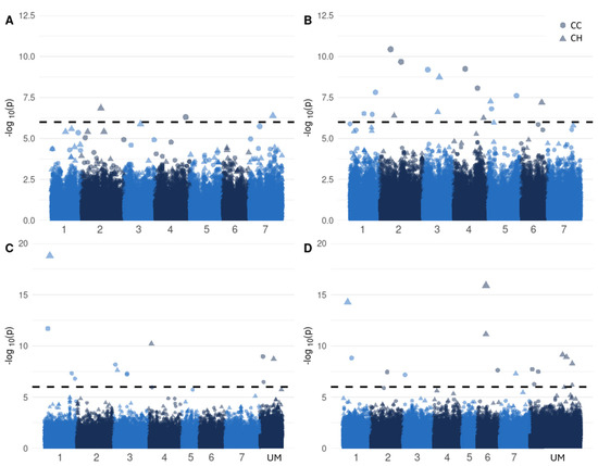 Manhattan plots from GWAS on DR in red clover, displaying significant associations for: (A) traits in the drought period; (B) the recovery periods of both years using the HEN-17-derived SNP set; (C) traits in the drought period; and (D) the recovery period of both years using the Milvus-derived SNP set. The dotted line represents the significance threshold after Bonferroni correction (α = 5%). Colors represent the different linkage groups (LG1 to LG7), and unmapped (UM) contigs.