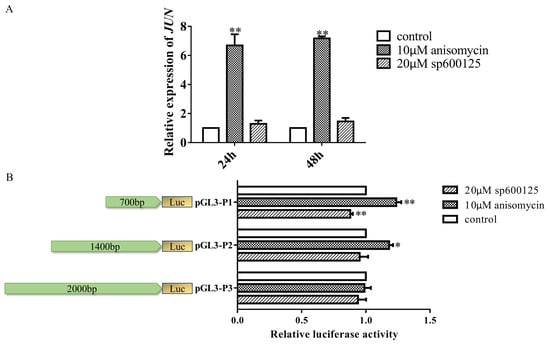 JNK signaling pathway activator activates JUN transcription. (A) JUN expression changes in DF-1 cells treated with the JNK signaling pathway activator (10 μM anisomycin) and inhibitor (20 μM sp600125) were analyzed using qRT-PCR. (B) After transfecting the recombinant vectors for 24 h, the cells were treated with the JNK signaling pathway activator (10 μM anisomycin) and inhibitor (20 μM sp600125) for an additional 24 h. Relative luciferase activity of each vector was measured using the dual-luciferase reporter assay. n = 3, *: p < 0.05, **: p < 0.01.