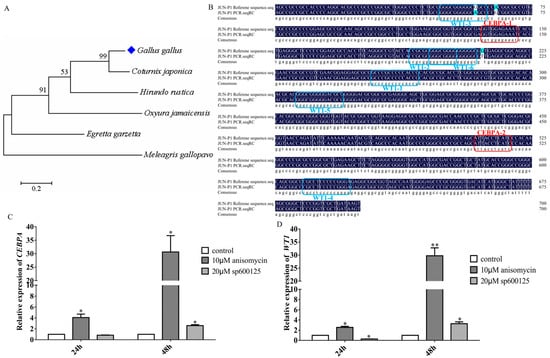 Bioinformatics analysis of −700–0 bp of the JUN promoter. (A) Phylogenetic analysis of the −700 to 0 bp upstream region of JUN in different species. (B) Predicted transcription factor binding sites in the −700 to 0 bp region upstream of the chicken JUN transcription start site, with WT1 and CEBPA being the primary factors. The suffix numbers indicate predicted scores, decreasing from 1 to 6. (C,D) Expression changes of CEBPA and WT1 in DF-1 cells after treatment with the JNK signaling pathway activator (10 μM anisomycin) and inhibitor (20 μM sp600125), as detected by qRT-PCR. n = 3, *: p < 0.05, **: p < 0.01.
