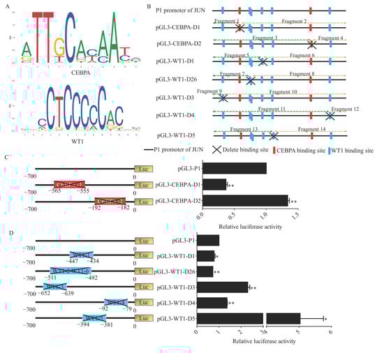To further verify the effects of WT1 and CEBPA binding sites (Figure 4A) on the JUN promoter, deletion vectors lacking the WT1 and CEBPA binding sites were constructed (Figure 4B and Figure S3), respectively. JUN promoter activity was significantly altered when WT1 and CEBPA binding sites were deleted (Figure 4C,D). Upon deletion of CEBPA binding sites 1 and WT1 binding sites 1, 2 and 6, activity of −700–0 bp of the JUN promoter was inhibited. When CEBPA binding sites 2 and WT1 binding sites 3, 4, and 5 were deleted, the activity of −700–0 bp of the JUN promoter increased.