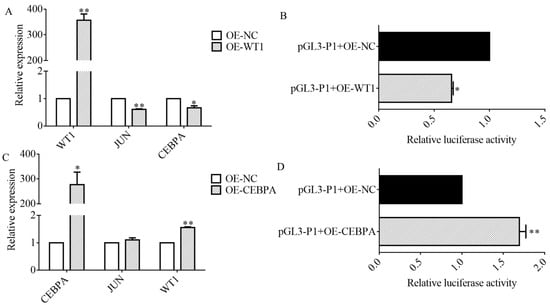 WT1 and CEBPA affected JUN transcription. (A) After overexpression of WT1, mRNA levels of WT1, JUN, and CEBPA were detected by qRT-PCR. (B) After overexpression of WT1, relative luciferase activity of pGL3-P1 was detected by dual-luciferase reporter assay. (C) After overexpression of CEBPA, mRNA levels of CEBPA, JUN, and WT1 were detected by qRT-PCR. (D) After overexpression of CEBPA, relative luciferase activity of pGL3-P1 was detected by dual-luciferase reporter assay. n = 3, *: p < 0.05, **: p < 0.01.