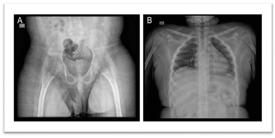 Radiographic Images. (A) Pelvis: Morpho structural changes in both hips characterized by verticalization and flattening of the acetabula, as well as cortical thickening of the femoral diaphysis bilaterally and apparent hypotrophy of the quadriceps muscles. (B) Spine: Slight deviation of the thoracolumbar spine to the right, with no vertebral rotation.