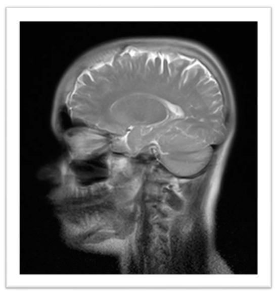Brain Magnetic Resonance Imaging: calcification in the anterior aspect of the falx cerebri, hyperostosis of the inner calvaria table in the frontotemporoparietal regions, and asymmetry of the petrous apices.
