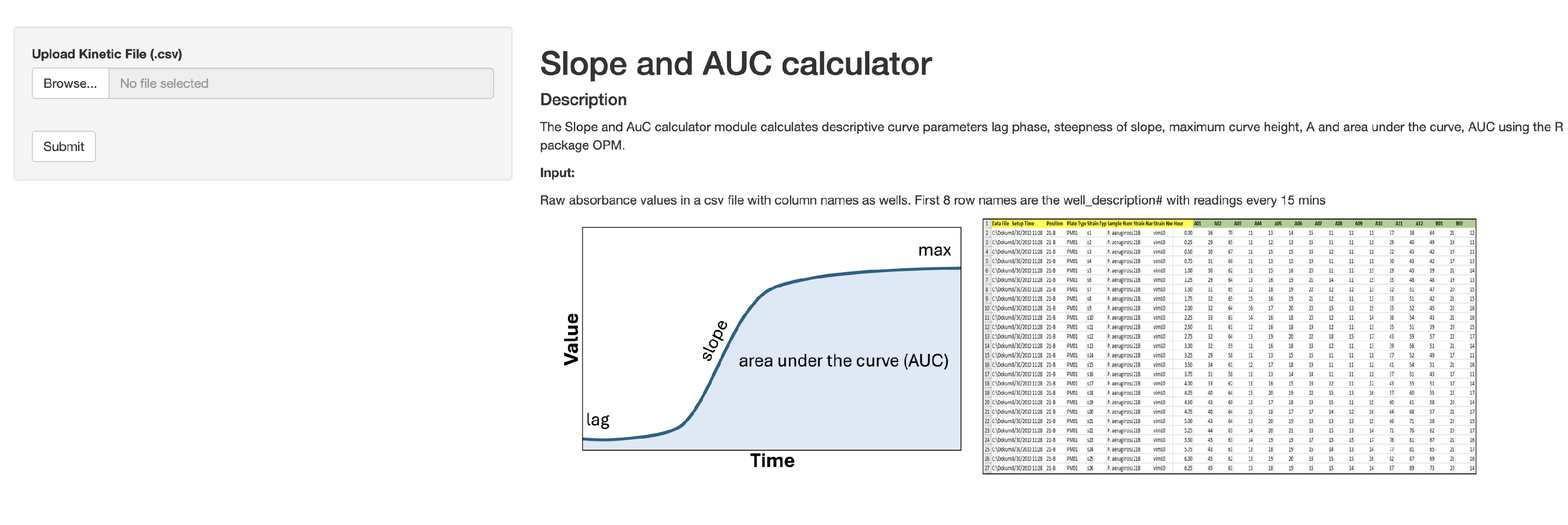 - Slope and AUC Calculator: The “Slope and AUC” module calculates the descriptive curve parameters, including lag phase, steepness of the slope, maximum curve height, and area under the curve, AUC.