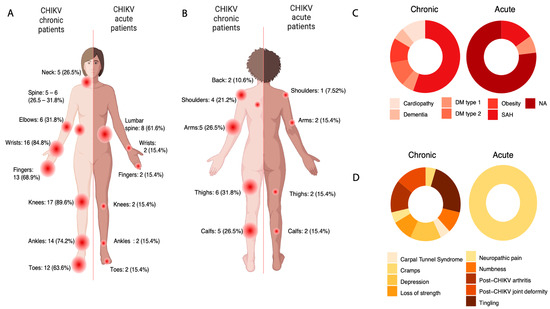 Symptoms and comorbidities panel reported by patients manifesting chronic and acute signs of Chikungunya virus infection. (A) Compromised joints in individuals with chronic and acute Chikungunya virus infection. For 10 acute individuals, it was not possible to retrieve data regarding the arthralgia sites. (B) Points of myalgia reported by chronic and acute individuals for Chikungunya virus infection. For 10 acute individuals, it was not possible to retrieve data about the myalgia points. (C) Pre-existing comorbidities described by individuals chronically affected by Chikungunya virus and individuals in the acute phase; (D) Secondary manifestations indicated by chronic and acute individuals for Chikungunya virus reported by clinical examination and medical record.