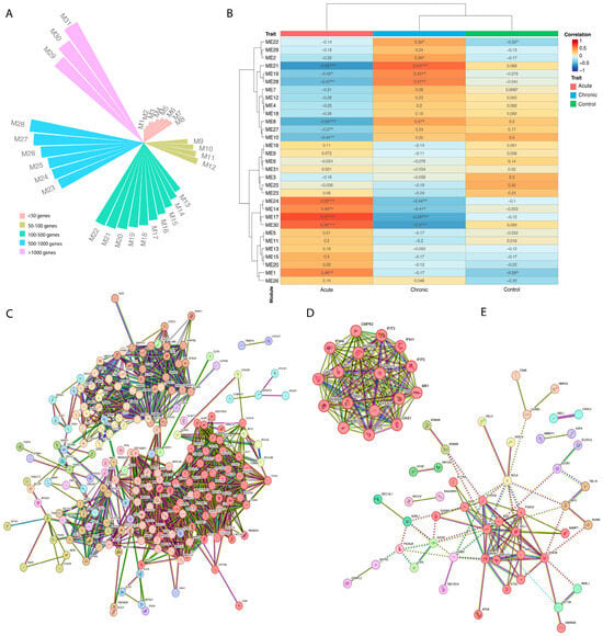 Weighted Gene Coexpression Network Analysis (WGCNA) for distinct Chikungunya virus infection stages and control group. (A) Composition of gene modules found differentially coexpressed in acute and chronic individuals for Chikungunya virus. In red are modules with a size of less than 50 genes; in olive modules comprising 50–100 genes; in green modules containing up to 500 genes; in blue gene size modules between 500 and 1000; and, in magenta, modules larger than 1000 genes. (B) Coexpression trait heatmap of the 31 modules was found to differentially coexpress in patients in the acute stage of infection and individuals in the chronic stage. The rows represent each of the 31 modules found, while the columns represent the different clinical stages of Chikungunya virus infection. Positive correlations are indicated in shades of red, while negative correlations are in shades of blue. *: p-values < 0.05; **: p-values < 0.01; ***: p-values < 0.001. (C) Coexpression module M30 positively correlated with CHIKV acute patients and negatively correlated with chronic individuals. Image obtained using the STRING software. Genes are colored based on subclustering identification using the MCL clustering algorithm (Table S6). (D) Coexpression module M17 positively correlated with CHIKV acute patients and negatively correlated with chronic individuals. Image obtained using the STRING software. Genes are colored based on subclustering identification using the MCL clustering algorithm (Table S7). (E) Coexpression module M28 negatively correlated with acute patients and positively correlated with CHIKV chronic individuals. Image obtained using the STRING software. Genes are colored based on subclustering identification using the MCL clustering algorithm (Table S8).