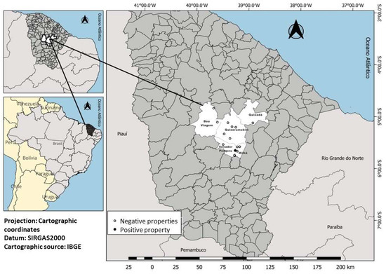 - Pimentel, A. Diário do Nordeste. Little-Known Disease Threatens Cattle Herd in Ceará. 2019. Available online: https://diariodonordeste.verdesmares.com.br/regiao/doenca-pouco-conhecida-ameaca-rebanho-bovino-no-ceara-1.2106015 (accessed on 11 January 2023).