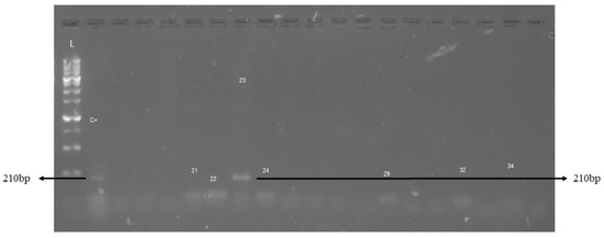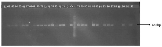 After the reagents were added, the samples were transferred to a thermal cycler, where the time was set at 35 cycles at 94 °C for 1 min for denaturation, 52 °C for 2 min for annealing and 72 °C for 3 min, followed by 72 °C for 10 min for final extension. After amplification, the products were added to glass plates for electrophoresis containing a molecular weight standard and positive and negative control samples (distilled water), in 1.5% agarose gel and ethidium bromide. For all reactions, known positive DNA samples for the agent under investigation were used as positive controls [13], while DEPC water was used as a negative control. Reading was performed on a ultralight (UV) transilluminator, and sample amplifications were compared with the molecular weight standard, positive and negative control version 5.0 (Prism Software®, Irvine, CA, USA).