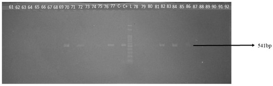 Detection of the B. bovis SS rRNA gene by conventional PCR in dairy cows from the central hinterland of Ceará, 2021/2022. L: molecular weight marker, 100 bp. C+: positive control; C−: negative control; Samples 70, 72, 75, 77, 78, 82, 84, 86: amplification of a fragment of approximately 541 bp specific to the B. bovis SS rRNA gene.