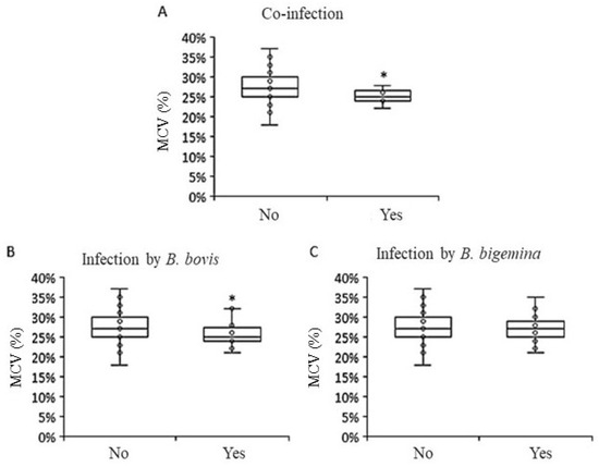 Correlation between independent samples and percentage of mean corpuscular volume for co-infection by B. bovis and B. bigemina (A) (p = 0.04) and infection only by B. bovis (B) (p = 0.05) and B. bigemina (C) (p = 0.50) of dairy cows from the central hinterland of Ceará. * = difference p ≤ 0.05 between groups evaluated. MCV = mean corpuscular volume; No = non-infected animals; Yes = animals infected by parasites.