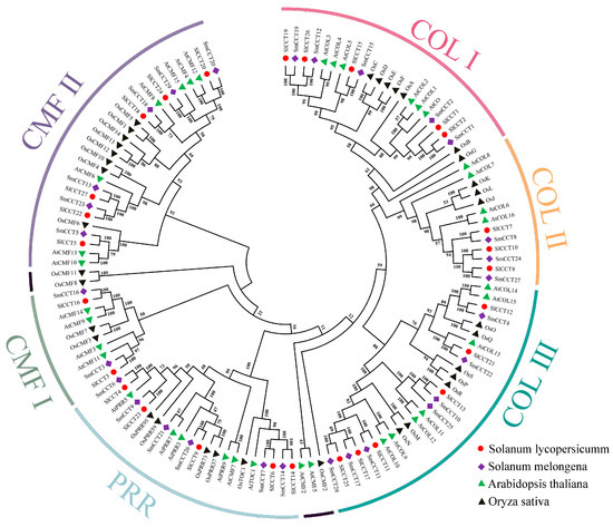 To understand the evolutionary relationships between tomato, eggplant, rice, and Arabidopsis, a maximum likelihood phylogenetic tree was constructed based on CCT acid sequences (Figure 1). It can be clearly clustered into six subgroups: COL I, COL II, COL III, PRR, CMF I, and CMF II, and most members of the same subfamily were clustered into the same subgroups. In particular, OsCMF2, OsCMF8, OsCMF11, AtCFM2, and AtCMF5 were not divided into subgroups because of their low bootstrap values. As expected, tomato and eggplant had higher CCT gene homology than the monocot plant rice. In addition, in the same subgroups, the number of CCT genes in tomato and eggplant was the same but different from that in Arabidopsis, such as the COL I (5), COL II (3), CMF I (2), and CMF II (6) subgroups, indicating that the four subgroups experienced the same changes in the evolutionary pathways.