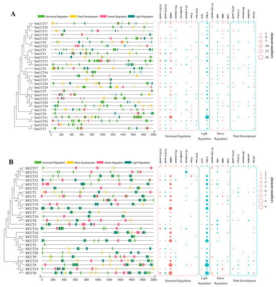 Cis-acting element analyses of SlCCT (A) and SmCCT (B). Different color squares represent the distributions of different cis-acting elements in the CCT gene promoter. Circles of different sizes represent the numbers of different promoters of cis-elements in the CCT genes.